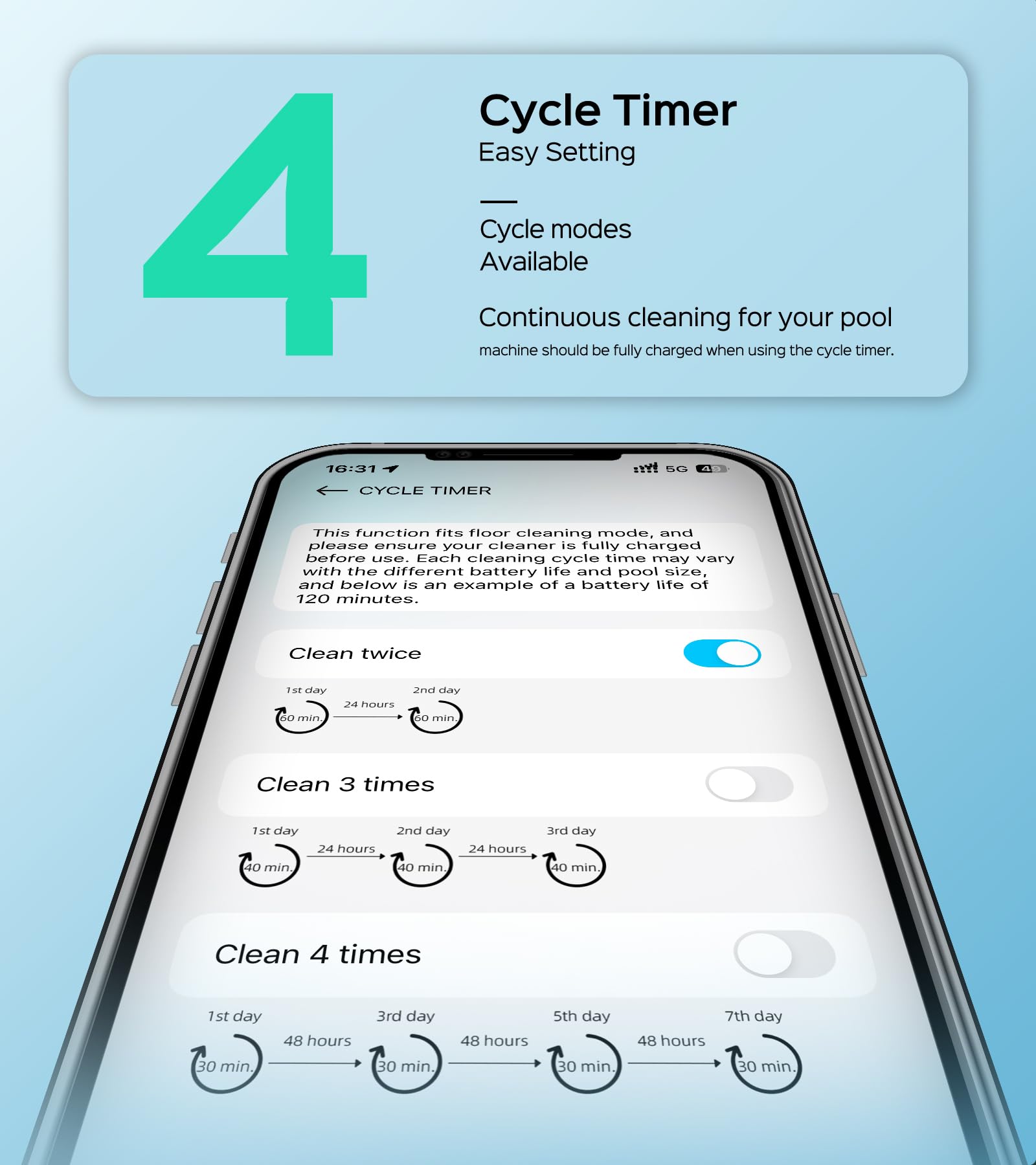 - Touch Switch/APP Mode - This innovative pool robot vacuum allows you to select the desired cleaning mode including floor, wall, and waterline with a gentle touch. Through the WYBOT App, you can choose from 7 cleaning modes and 6 wall and floor cleaning paths to suit your needs. Additionally, a preset timer allows you to customize cleaning schedules for your pool's specific requirements. Note: Please change the cleaning mode of the robot when on shore.