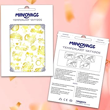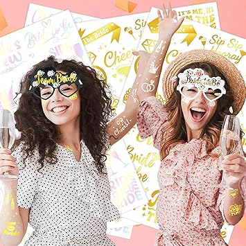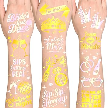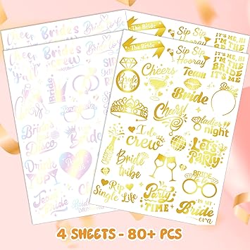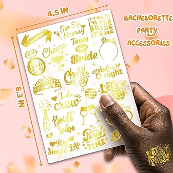 Make the bride-to-be feel extra special on her big day or night with our bachelorette party tattoos - the perfect accessory for an unforgettable party. Cheers Bachelorette Tattoo Set: Our Cheers Bachelorette Tattoo Set includes 4 sheets with a total of 100 iridescent foil tattoos featuring handdrawn designs of diamonds, rings, sparkles,'Cheers', and more that guests will absolutely love! The Perfect Party Accessory: a fun addition to any bachelorette party, engagement or bridal shower decoration! Each sheet measures 4.5 ' x 6.3 ' creating the perfect size tattoos!