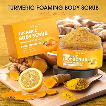 - 【EASY TO USE】Apply turmeric exfoliating body scrub on wet skin and gently massage in a circular motion, focusing on rough areas and rinse thoroughly. For best results, use this product regularly