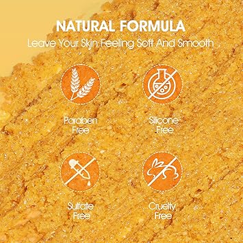 - 【NATURAL FORMULA】Paraben Free,Sulfate Free,Silicone Free,Cruelty Free. This turmeric body exfoliator features a unique and aromatic scent of turmeric that energizes your spirit and refreshes your skin, leaves you feeling serene and refreshed