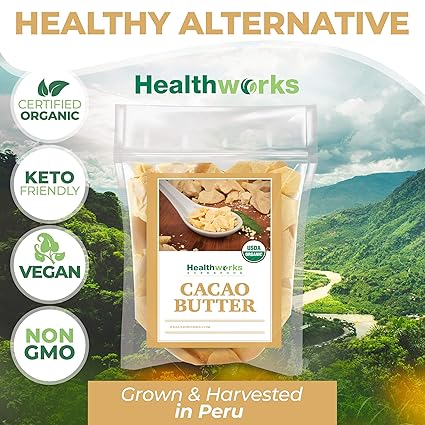 - MANY BENEFITS & NUTRIENTS: With a mild chocolate flavor, a smooth texture, heavenly smell, Healthworks Cacao Butter is packed with Antioxidants, Healthy Fats, Theobromine, Vitamin K & Vitamin E, our Cacao/Cocoa Butter is a healthy addition to your meals. Healthworks Cacao Butter is keto-friendly, vegan, non-GMO, and certified organic.