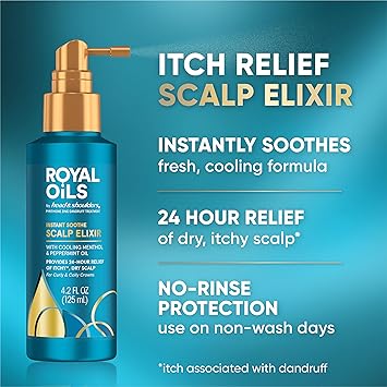 Experience a breakthrough in scalp health with Head & Shoulders Royal Oils Instant Soothe Scalp Elixir with Menthol & Peppermint Oil. This no-rinse, alcohol-free^ formula is specifically designed for use in between washes to relieve itchy,** dry scalp and is perfect for natural, relaxed, kinky and coily hair types. Infused with cooling menthol and peppermint oil, it is also free of sulfates, parabens and dyes. The formula soothes dry scalp on contact and provides all-day no-rinse scalp protection from itch and dryness.** It is easy to use: apply it directly to scalp up to four times daily to help balance and improve scalp health.* Proudly recommended by My Black is Beautiful.