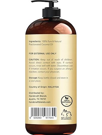 Handcraft Blends Fractionated Coconut Oil - 16 Fl Oz 100% Pure and Natural Premium Grade Carrier for Skin, Hair Body Massage Tonic