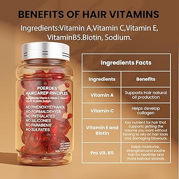 - Hair Vitamins: Moisture-rich hair vitamins capsules are enriched with vitamins to provide nutrients to the hair. Vitamins A, C, E and Pro B5 in essential oils nourish the scalp and strengthen hair from root to tip for healthier looking hair.