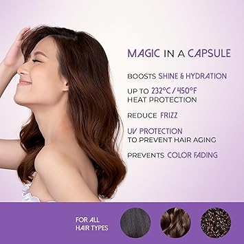 - Defend Against Damage - Protect your hair from heat styling up to 450°F / 232°C and UV exposure with our advanced formula. Enriched with Argan Oil, our capsules shield your hair from environmental stressors.