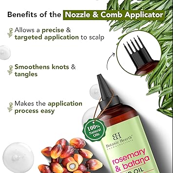 - Nozzle & Comb Applicator: The Rosemary & Batana Hair Oil for hair growth comes with hair oil applicators like nozzle and comb to evenly distribute oil and smoothen knots & frizzes, making the application process effortless