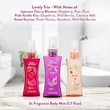 Body Fantasies fragrance body mists are formulated with only the highest quality oils for a fragrance to last all day. This collection of our sweet fragrances are perfect for any time of day and make a great gift! The Lovely Scents Collection gift set contains a body spray collection with 3 scents: Japanese Cherry Blossom, Sweet Sunrise, Pink Vanilla Kiss. With 3 unique fragrances, this gift set surely has a scent for every mood and occasion. Body Fantasies Fragrance is never tested on animals.