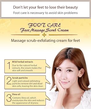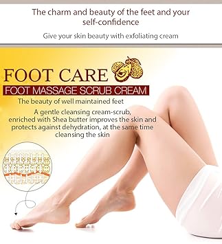 - Cream with scrub particles helps gently cleanse the skin from dirt and horny layer. Massage scrub-exfoliating cream for feet.