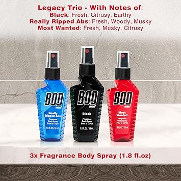 Stay ready with BOD man Body Spray. Sexy and long lasting, but not overpowering. BOD man fragrance body sprays are formulated with only the highest quality oils for a fragrance to last all day. BOD man's iconic easy-spray trigger reliably delivers fragrance. This collection of our classic fragrances is perfect for any time of day and make a great gift! This gift set contains a body spray collection with 3 scents: Black, Really Ripped Abs, Most Wanted. With 3 unique fragrances, this gift set surely has a scent for every mood and occasion.