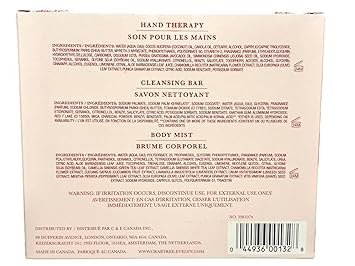 This gift set include 3 full sized classic Evelyn Rose scented products. - Hand Therapy, 3.5 oz - Bar Soap, 4.4 oz - Body Mist, 4 oz Top Notes - Italian Lemon (a burst of citrus), Elemi (aromatic resin), Olibanum (sharp frankincense), Cassis (refreshing blackberry) Middle Notes - Rose (a woody rose that's not your average pretty petal), Nutmeg (for added warmth), Cashmere woods (harmonic blend of musk and wood) Base notes - Vetiver (adds an earthy edge), Guaiac wood (an exotic wood that has hints of tarmac and smokiness), Musk (for a sensuous finish)
