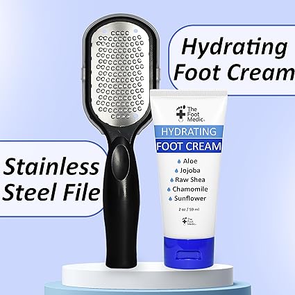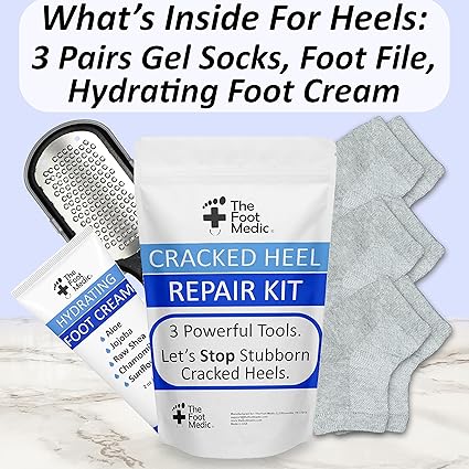 - 3 POWERFUL TOOLS: Package includes 3 pairs of Foot Medic moisturizing heel socks, 2 oz foot cream and one stainless steel foot file. This powerful kit is sure to get your heels back to the best they have been with regular usage. Cracked heel repair is only one cracked heel repair kit away.