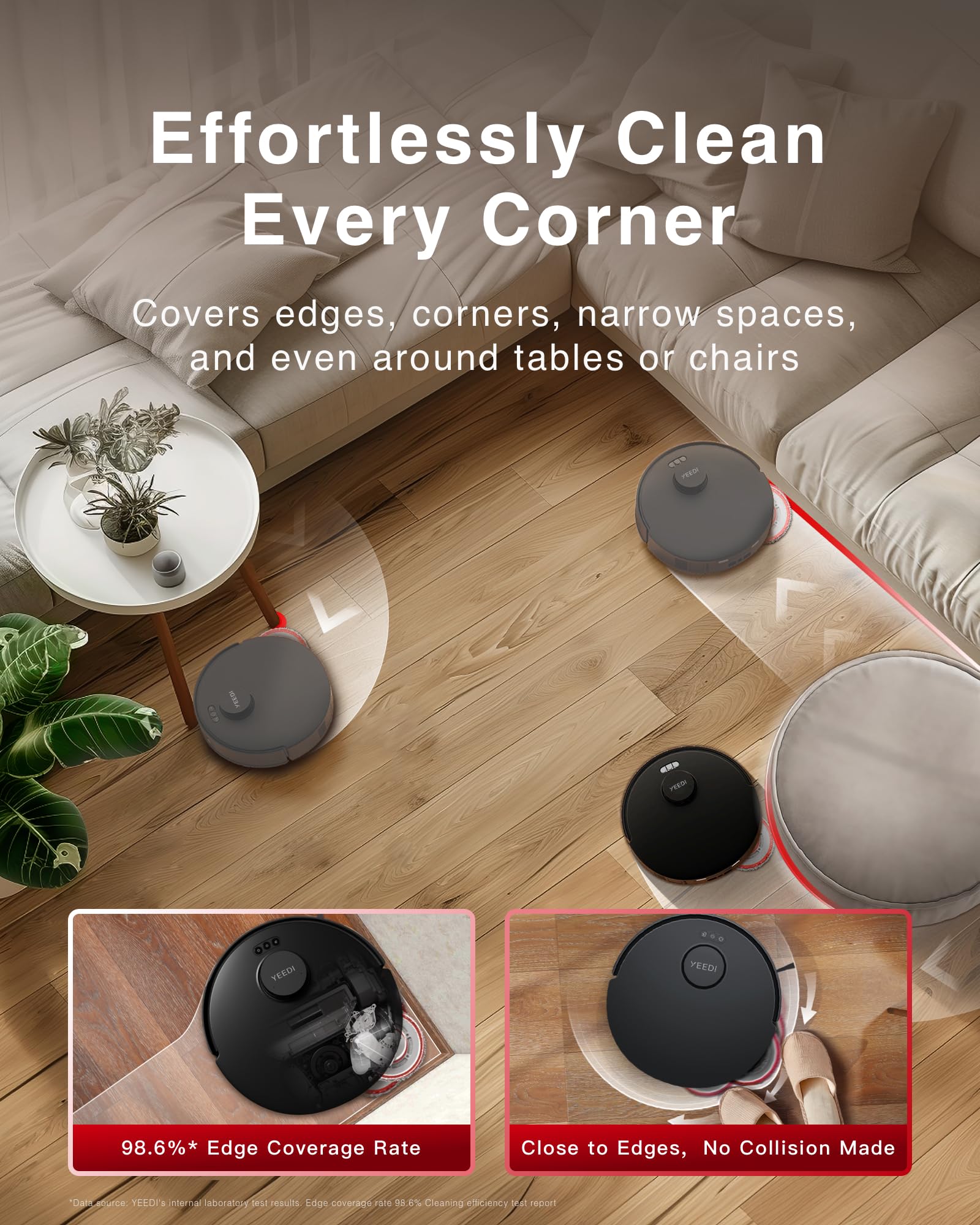 - TruEdge ADAPTIVE EDGE MOPPING - YEEDI M12 PRO+ ensures precise edge cleaning with a 0.039in proximity, a 98% boost in edge coverage, automatic retract for obstacle avoidance, intelligent decision-making for various obstacles, and a highly durable structure, guaranteeing efficient and lasting performance.