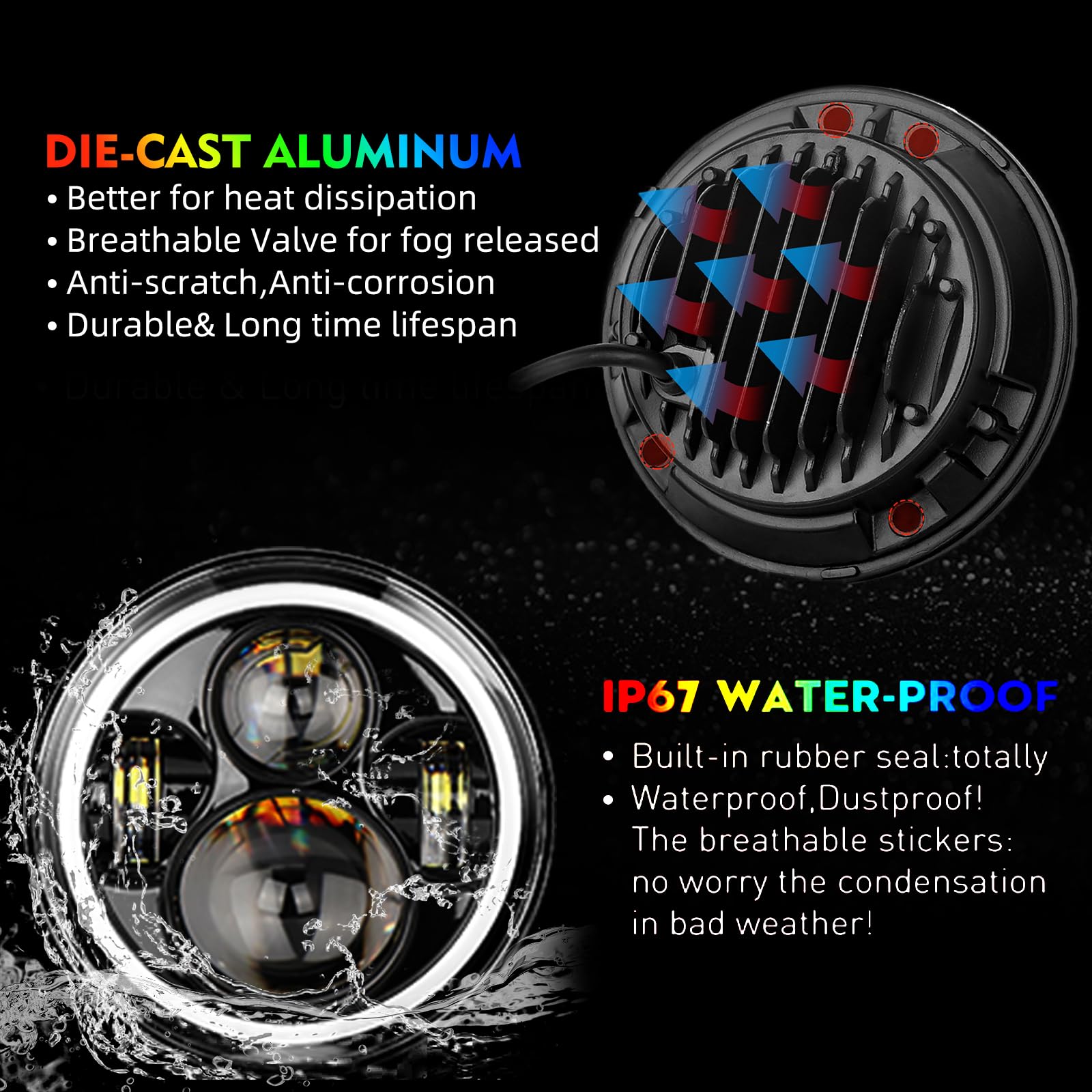 - High Speed Cooling: with IP68 Waterproof, for Wrangler headlights LED made of durable DIE-casting aluminum housing and polycarbonate lens,efficient cooling.Strong heat conductivity, antiseptic,anti-aging,weather resistance,dustproof,energy saving.It can maintain normal operation even in harsh environments such as deserts and snowy days.Can work in different weather from -40°C to +180°C