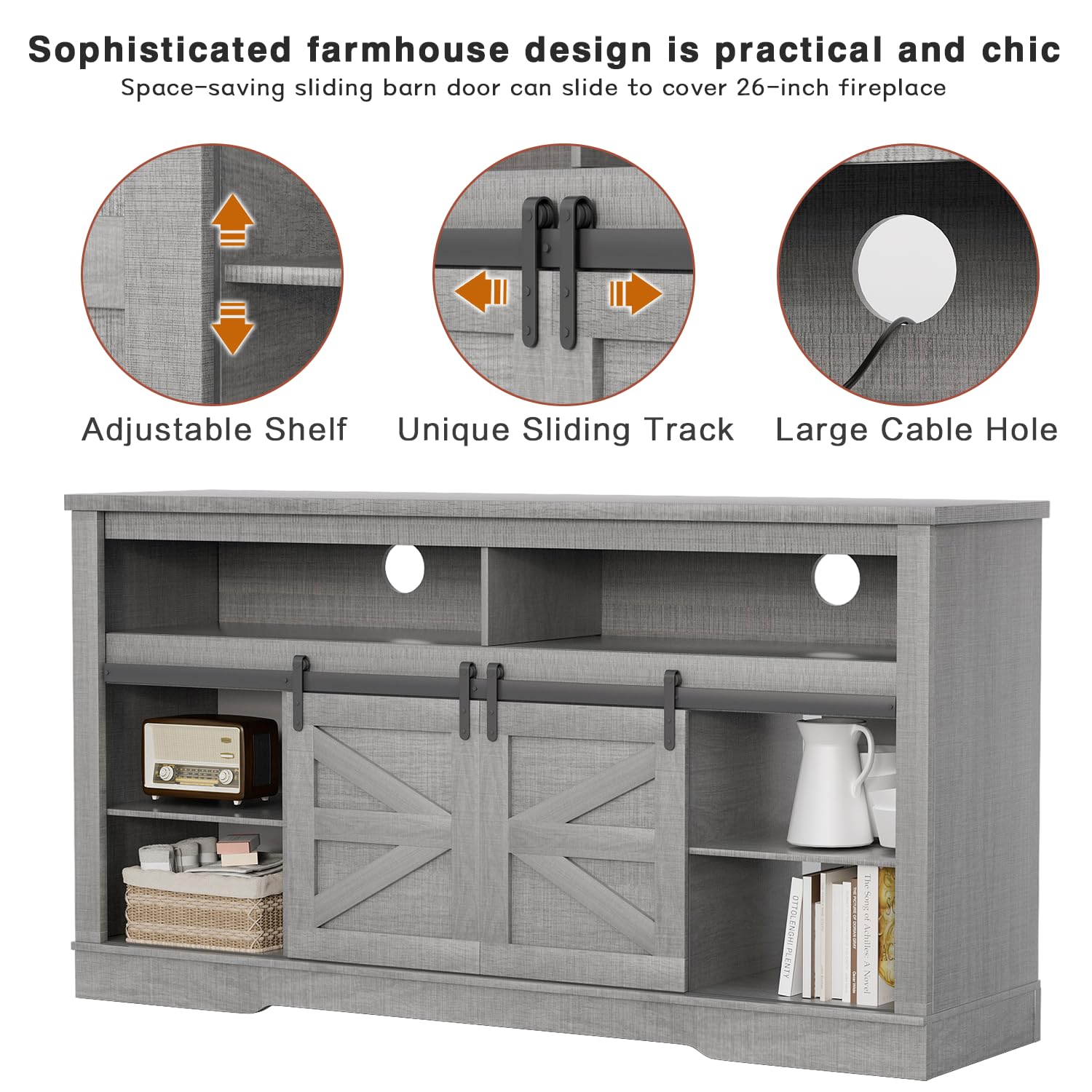 - Sliding Barn Door: The TV stand is equipped with two removable sliding barn doors, which makes it look nice. And compared to drawer design, sliding design are more convenient.