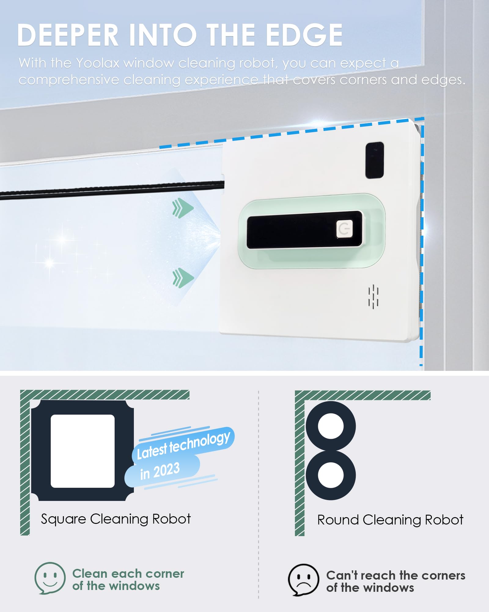 - 【Excellent Cleaning Effect】Yoolax robot window cleaner with a square shape is designed to clean every corner of the glass surface, effectively addressing the challenge of cleaning hard-to-reach areas. It offers three automatic cleaning paths to choose from, or you have the option to control it manually. Please notice that the robot needs to be plugged into power source while being used and the operational noise is under 80db